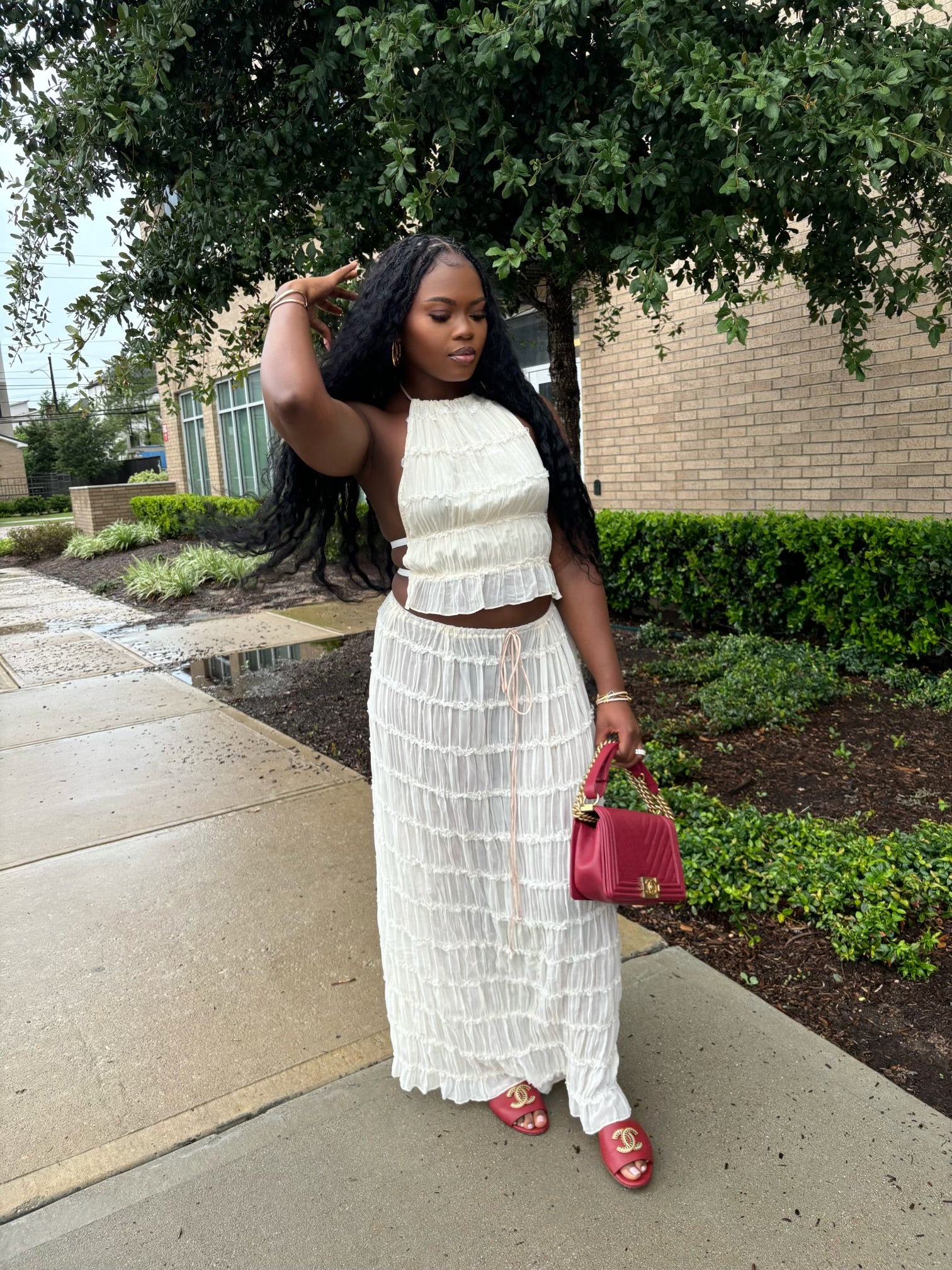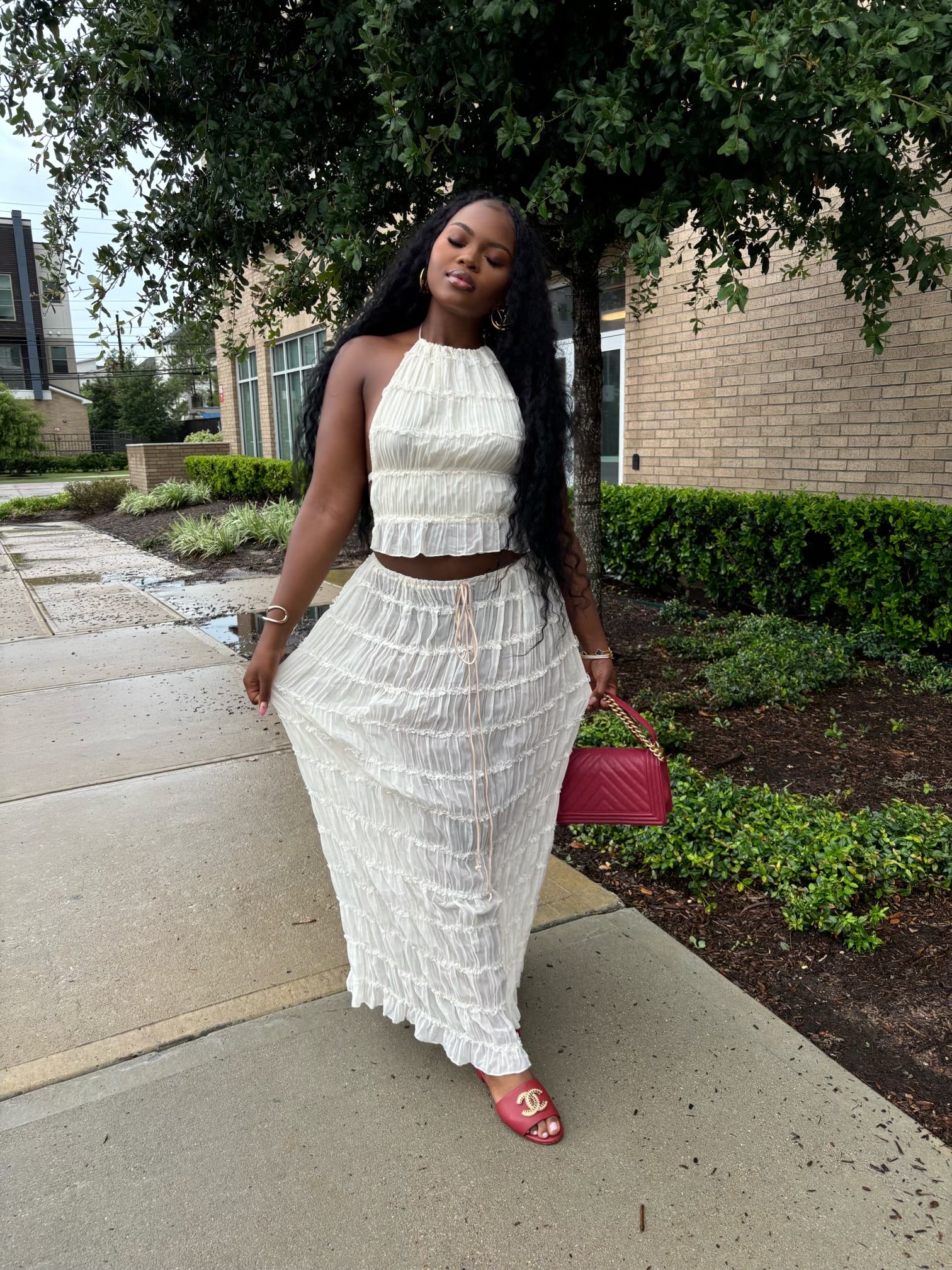 Two piece white set. An alter top paired with a maxi skirt. Item tuns true to size. Model is wearing a medium.
