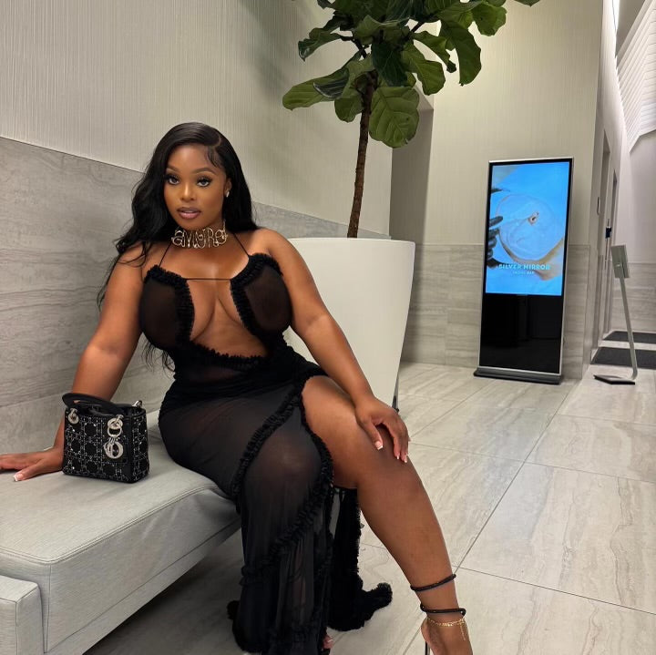 Black mesh maxi dress. Dress is see though with high thigh split. Item is stretchy. Item runs true to size. Model is wearing a medium.