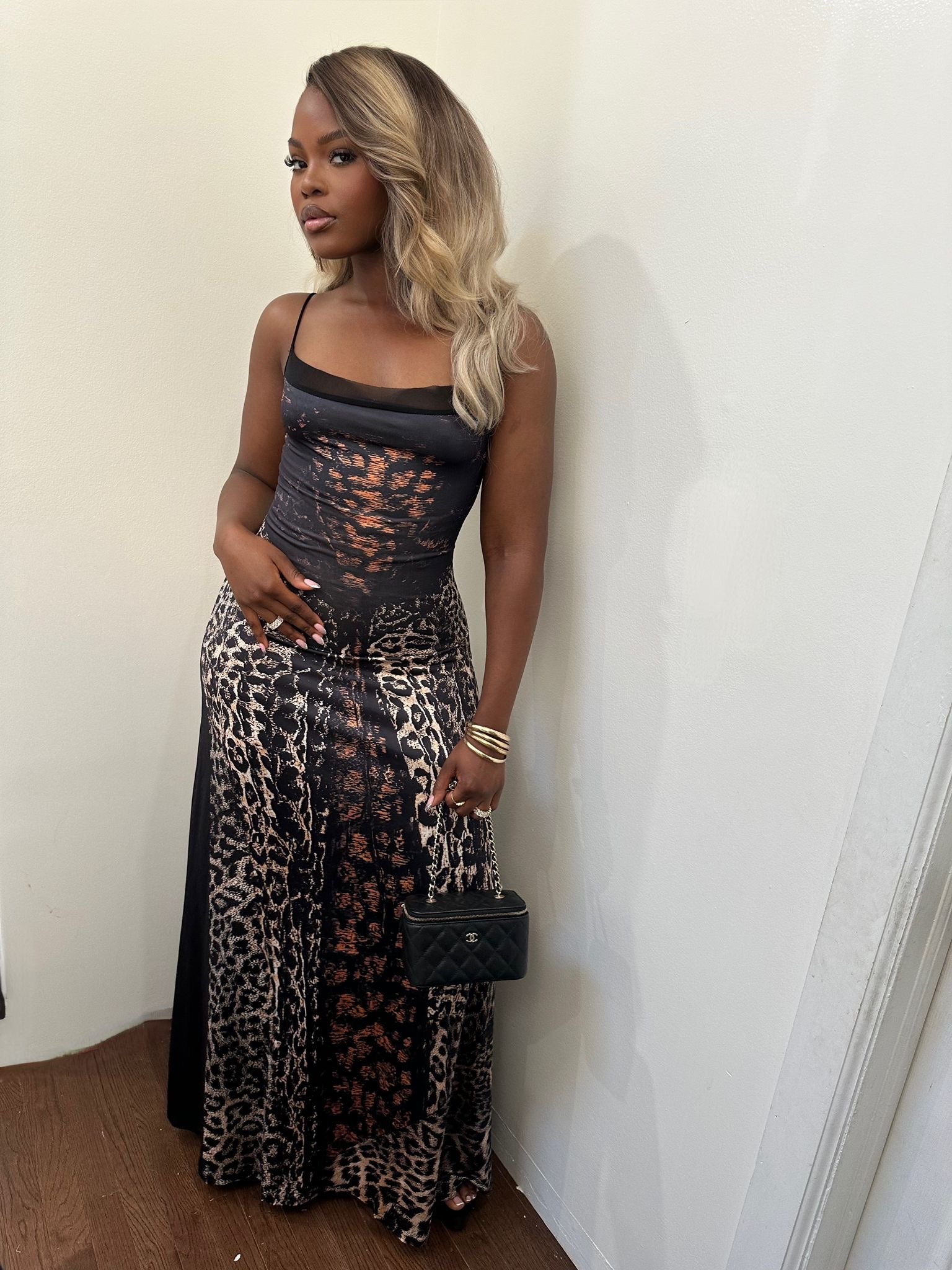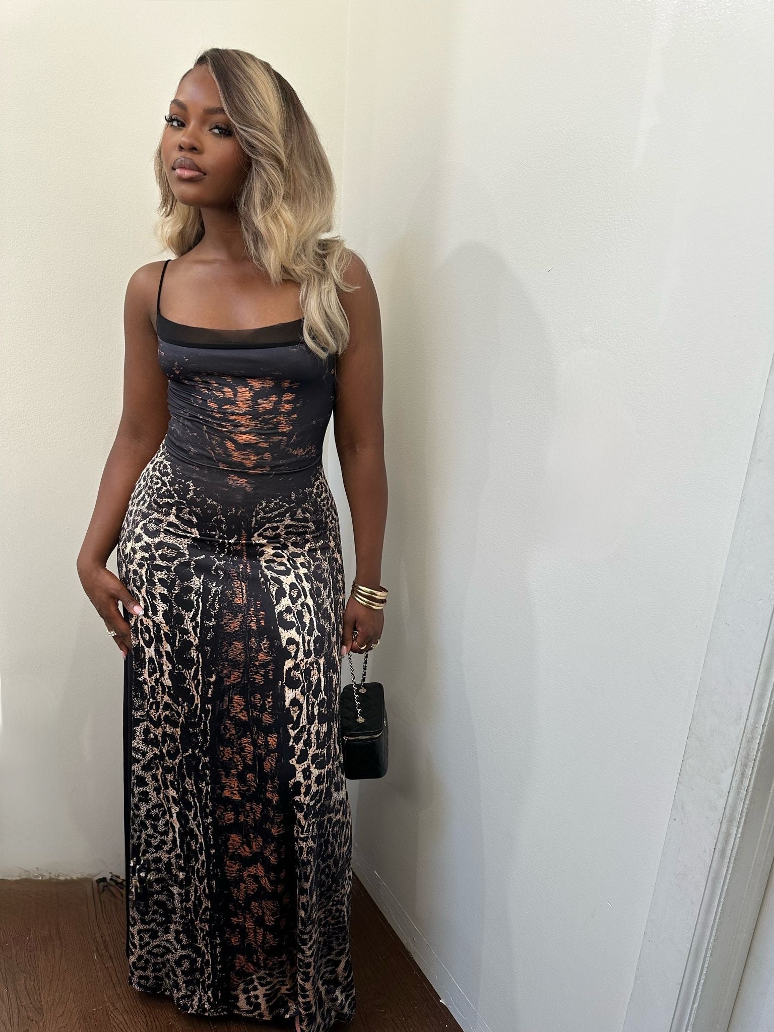 A Lycra cheetah print maxi dress. Lace up style in the back to give great fitness. Item runs true to size. Dress is stretchy.