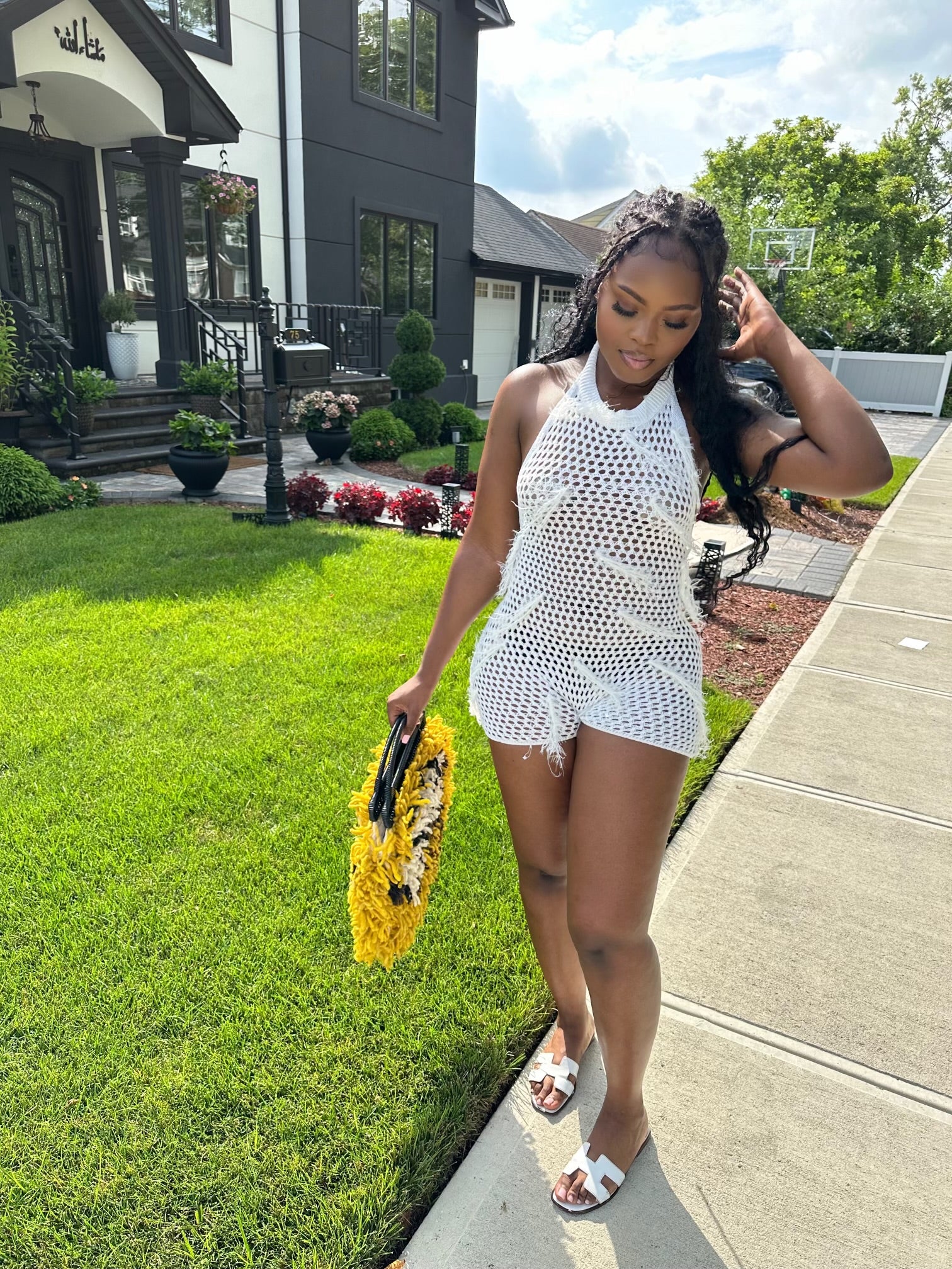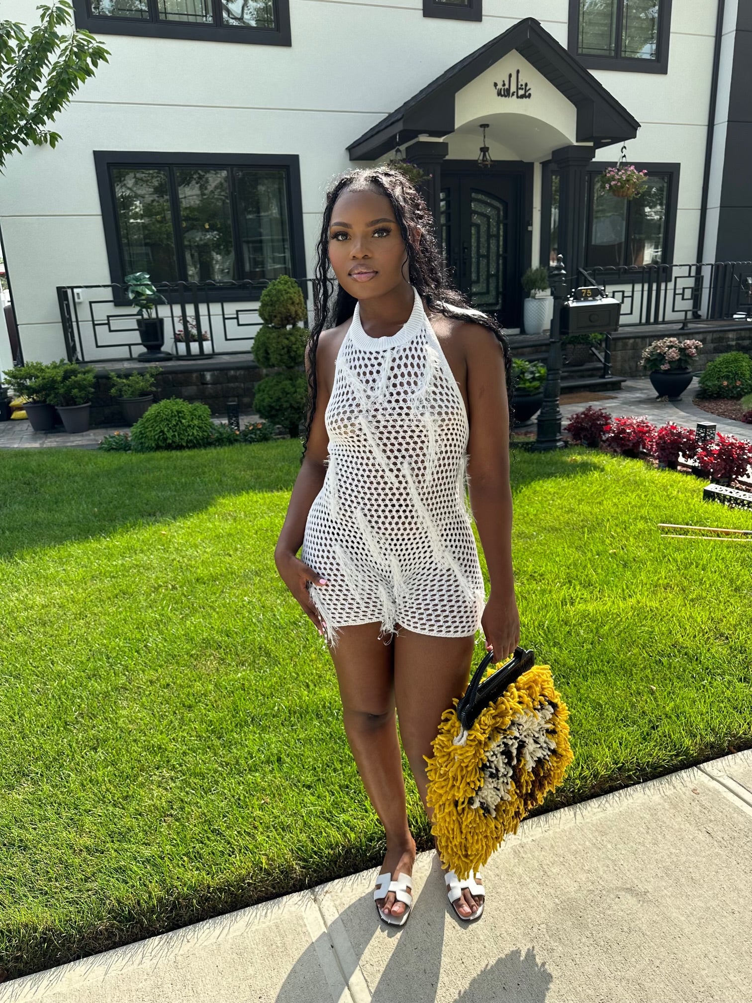 White midi jumpsuit. Crochet material with fringe. Back of jumpsuit is open. Perfect for all summer activities and beach wear.