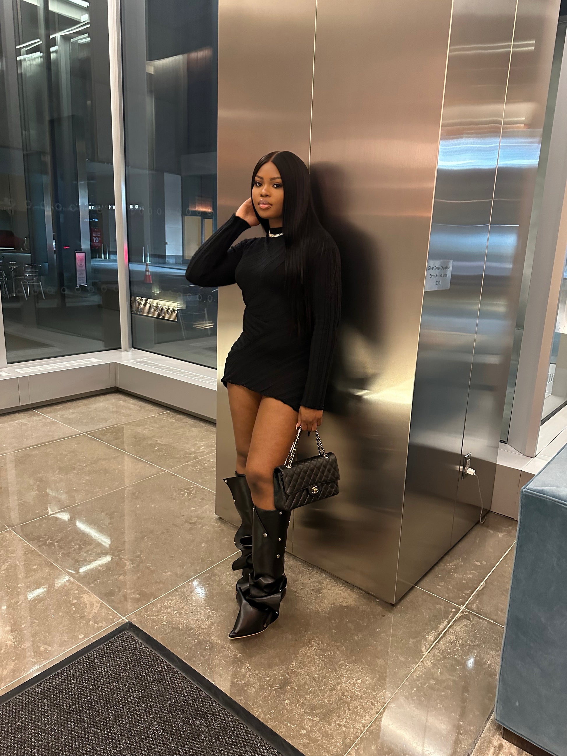 A black light sweater material dress. MIDI dress. Side of the dress is cut and revealed. Item is very stretchy. Item runs true to size.