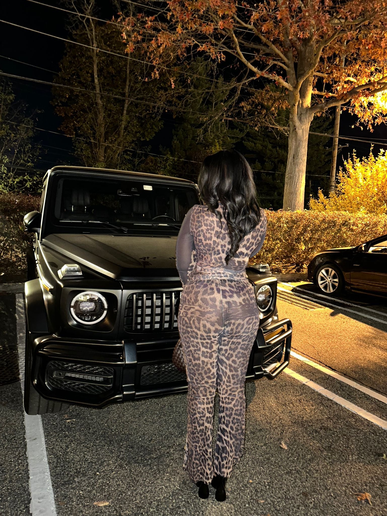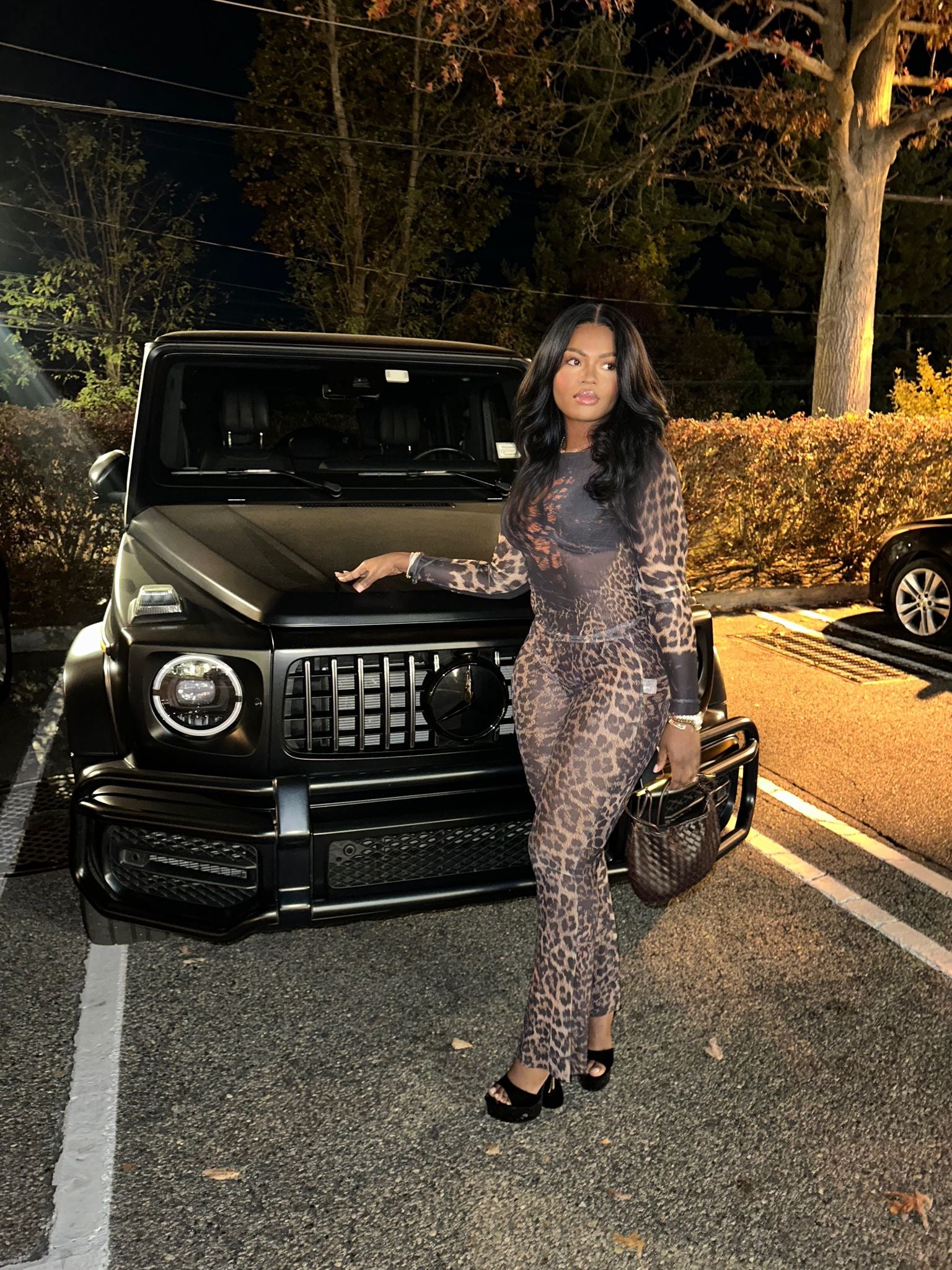 Two piece mesh cheetah print set. Top paired with flare pants. Brown and black color. Item runs true to size.