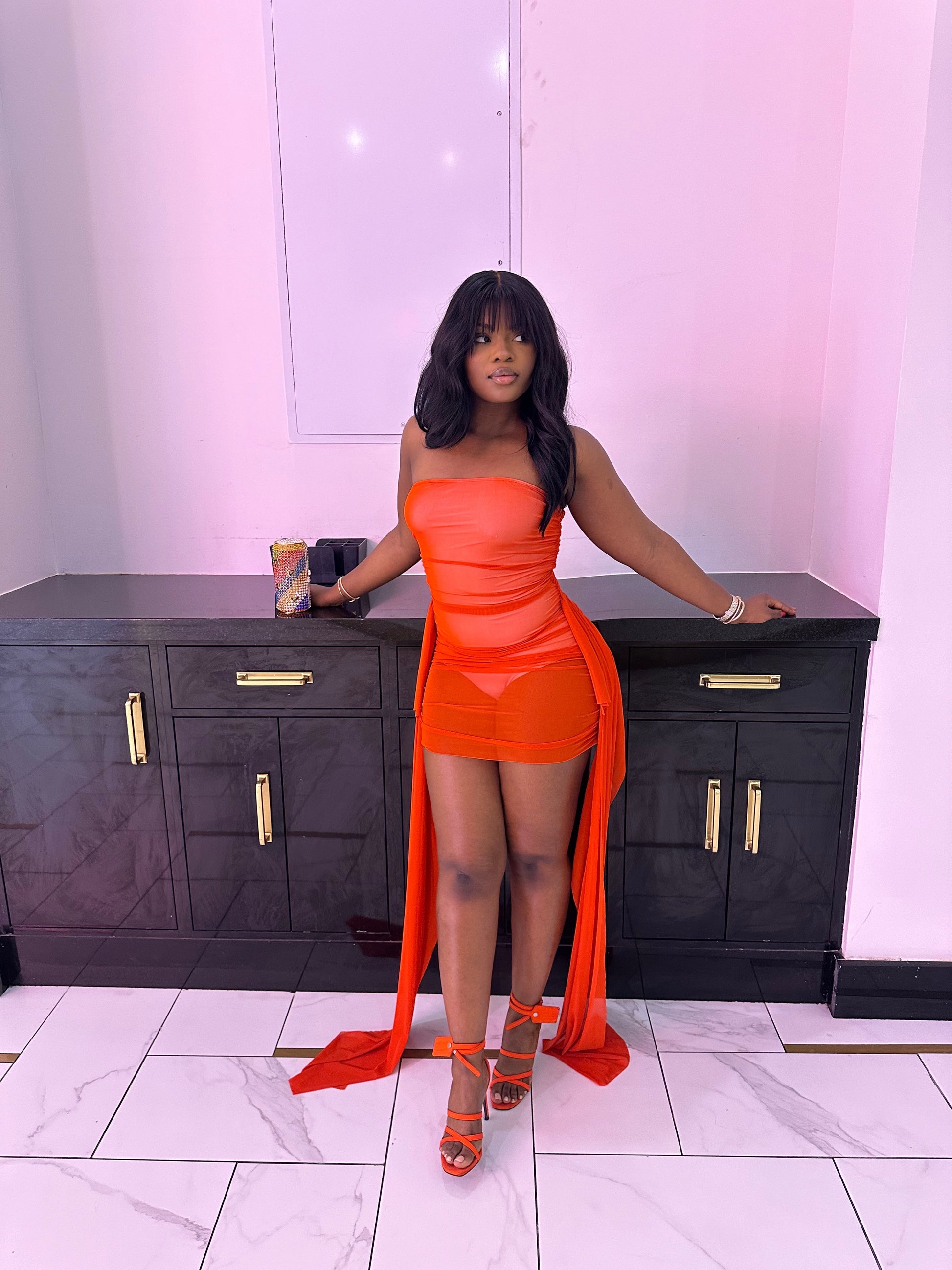 Mesh sleeveless dress with side attachment. Undergarment included. Dress also available in black. Item runs true to size. Model is wearing a medium.