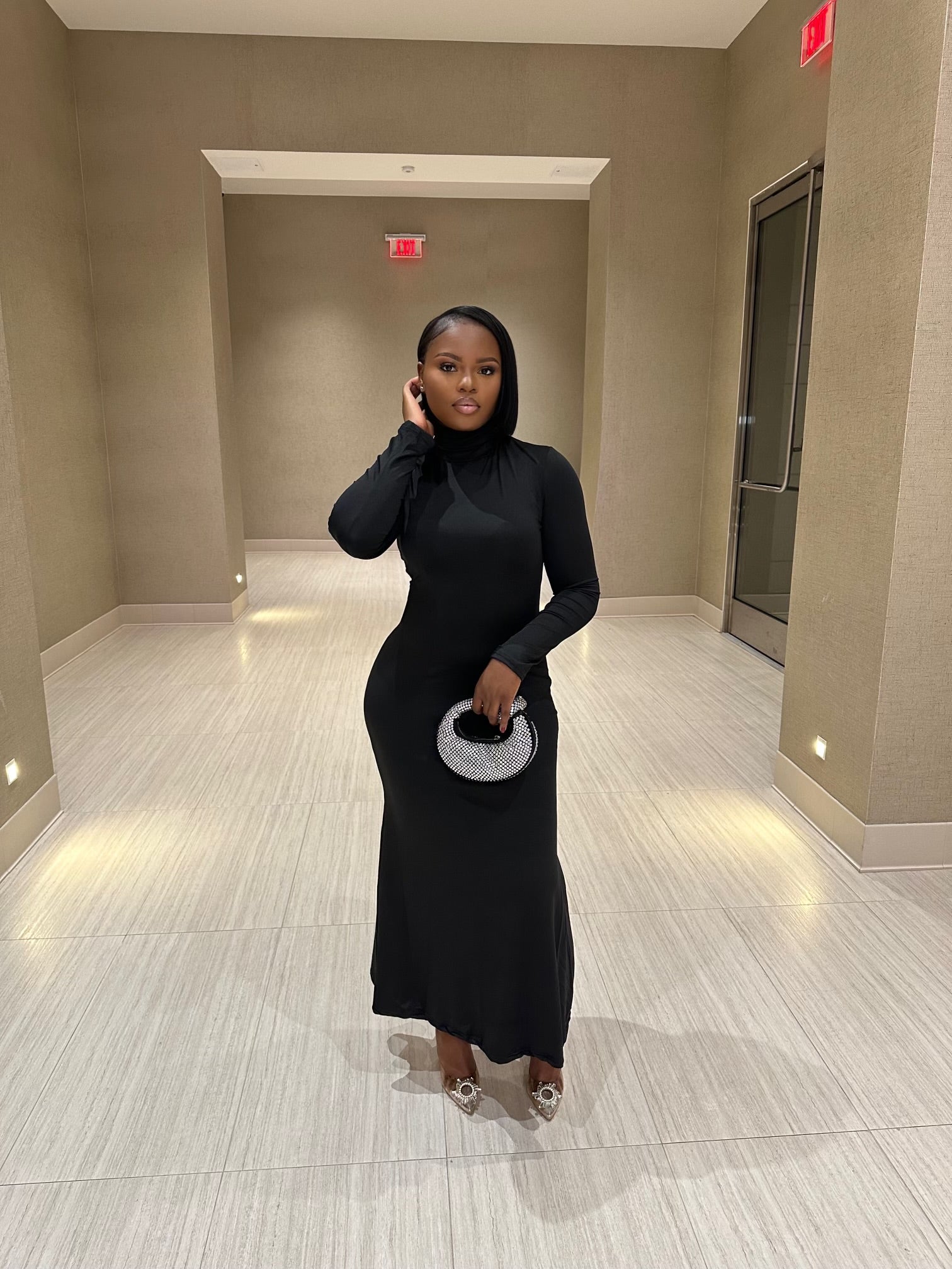 Black maxi turtle neck dress. Item is stretchy. Item runs true to size. Polyester material.