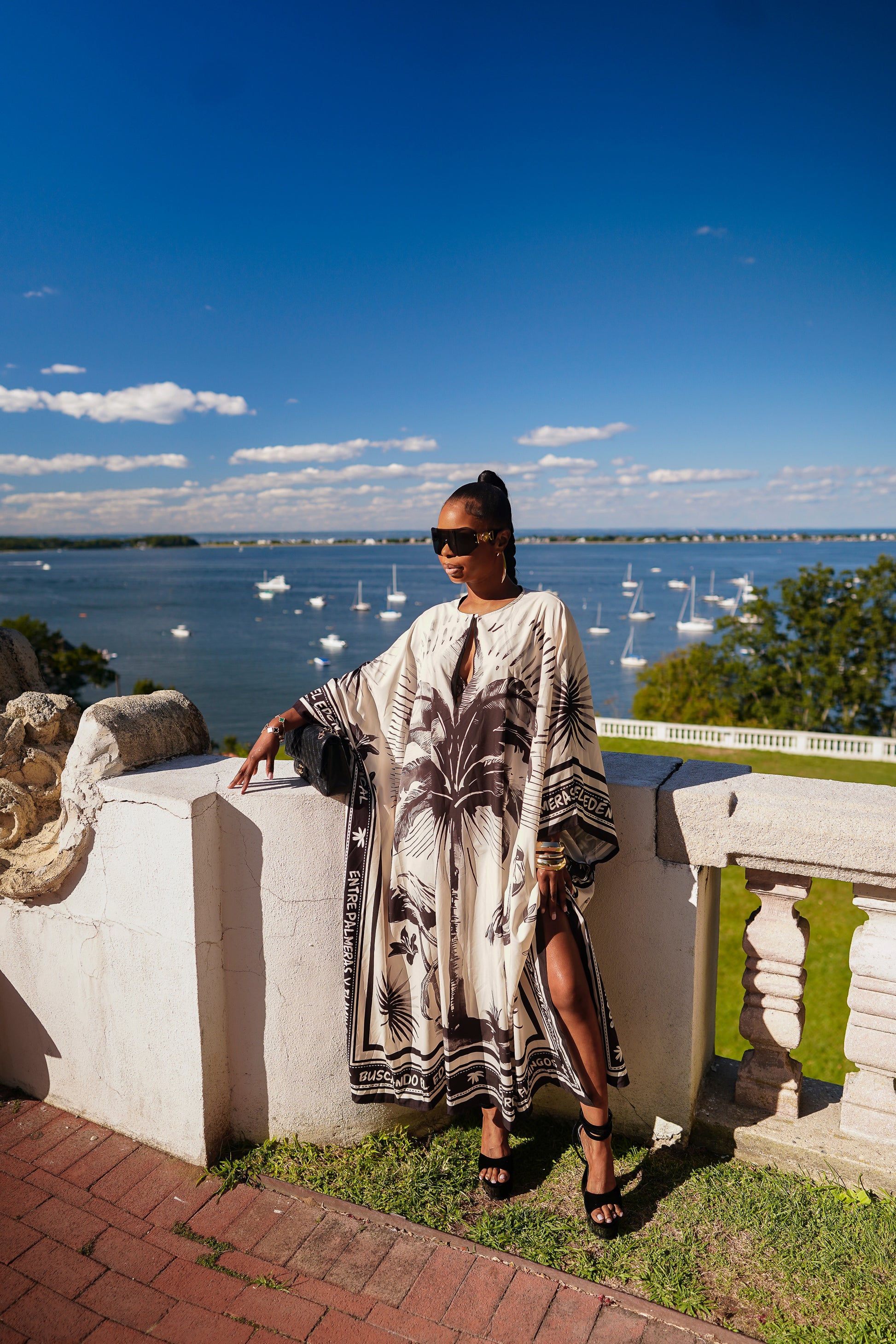 Loose kaftan dress. Black and white. Item runs true to size. Model is wearing a small.