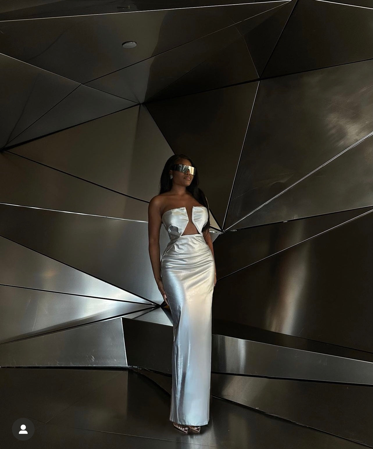 Black leather long maxi dress. Split at the back of the dress. Item runs true to size. Model is wearing a medium.