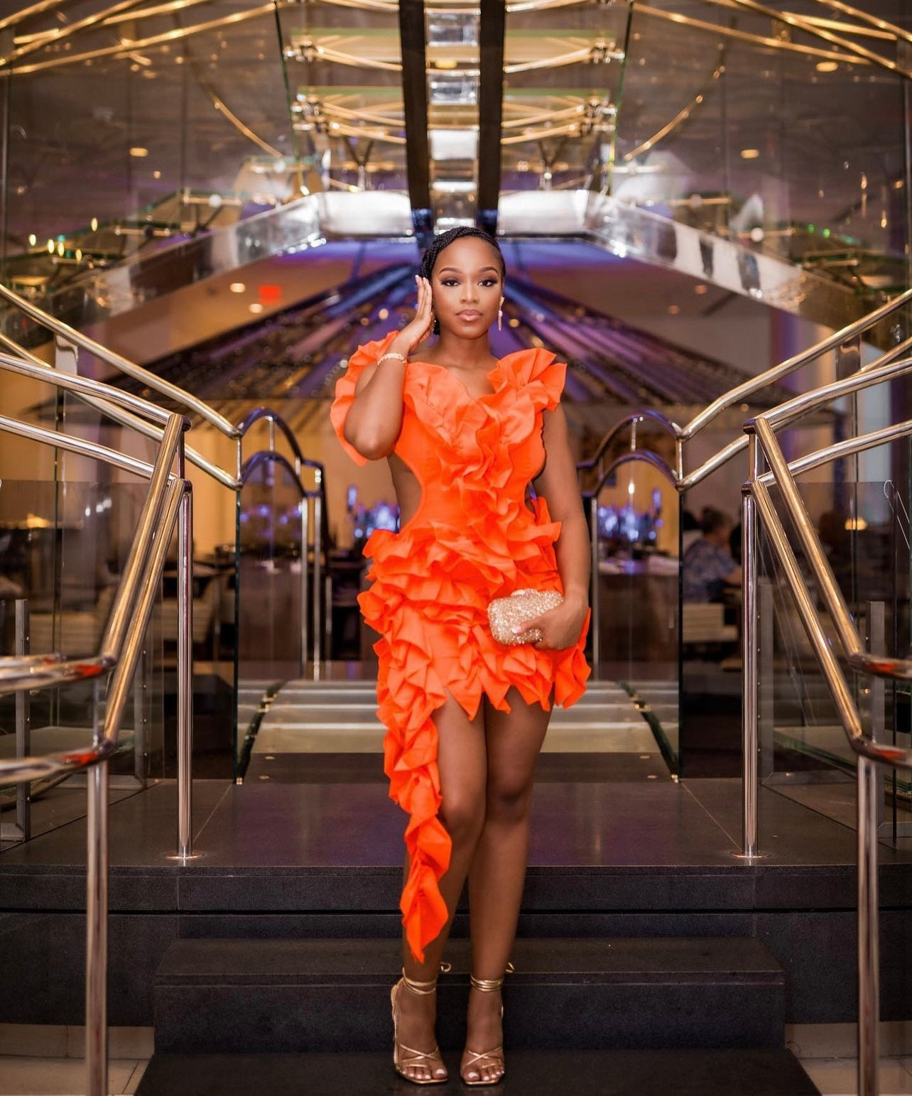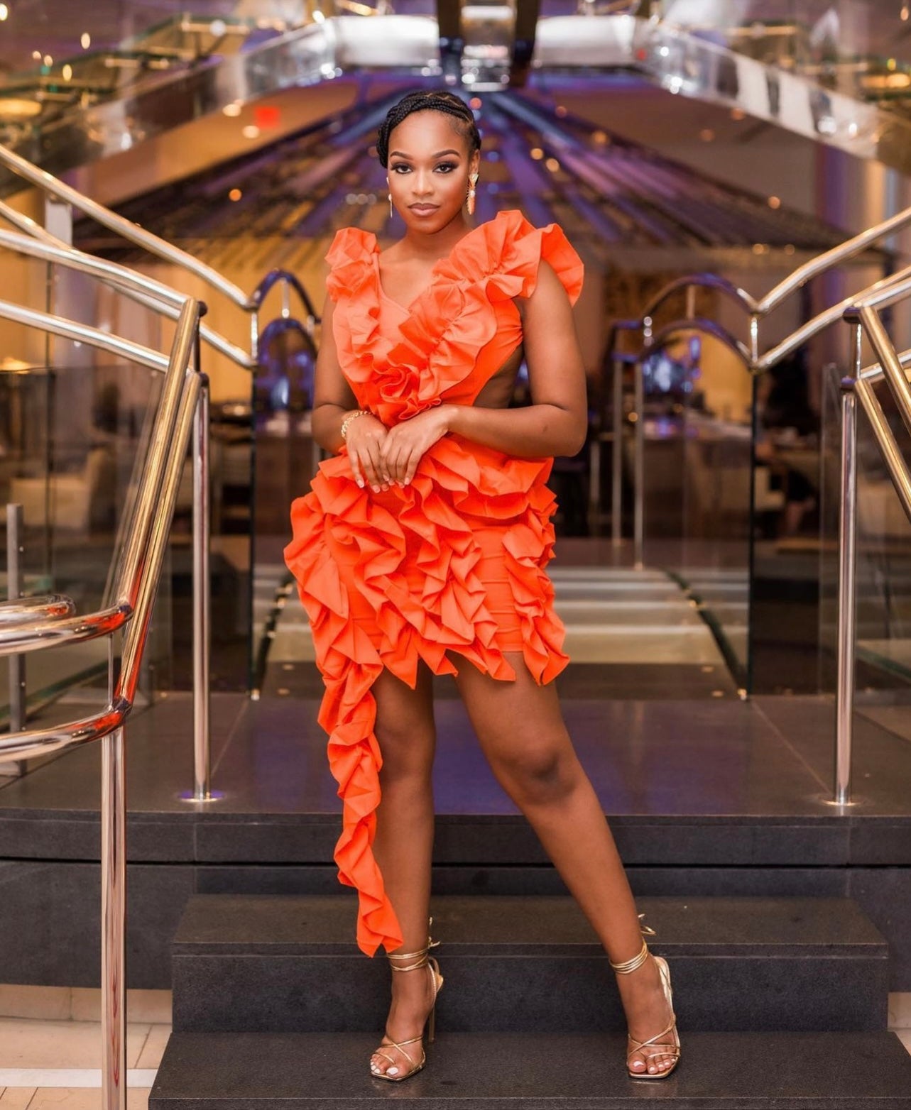 The Ruffle orange dress is a backless dress. Sleeveless and short with side ruffle length on the side. The side and back of the dress is also out.