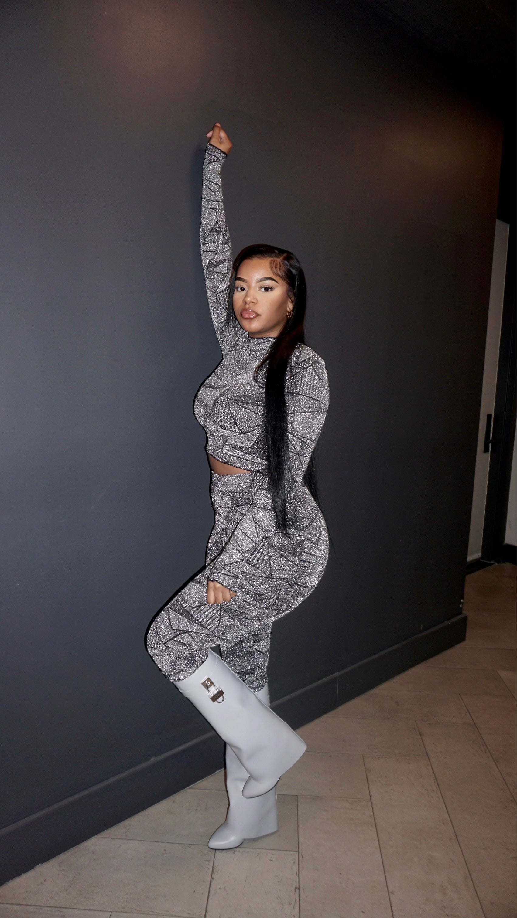 Silver and black set. Material is Lycra. Item is stretchy. Item runs true to size.