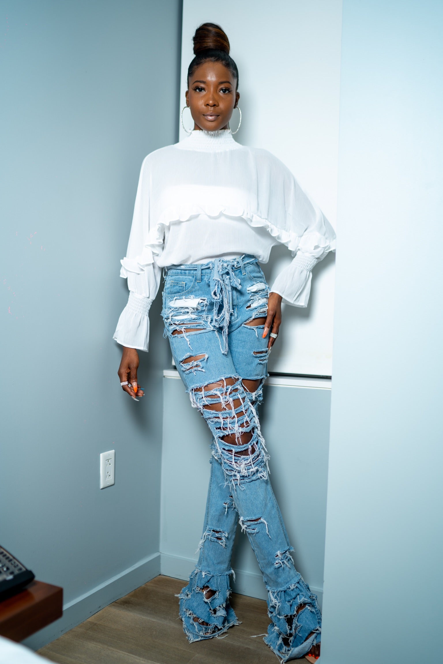 This white top can be paired with shorts or jeans. The material is see through.